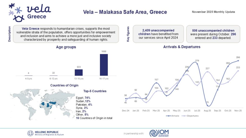 Η Vela Greece, τον Νοέβριο 2025 εξυπηρέτησε 506 ασυνόδευτα ανήλικα που διαμένουν προσωρινά στο Κέντρο Υποδοχής και Ταυτοποίησης Μαλακάσας. Το μεγαλύτερο ποσοστό αυτών κατάγεται από την Αίγυπτο, ενώ ακολουθούν 15 ακόμη χώρες σε μικρότερο ποσοστό. Συνολικά, 2.409 ασυνόδευτα ανήλικα έχουν ωφεληθεί από τις υπηρεσίες της Vela Greece από τον Απρίλιο 2024 που ξεκίνησε να δραστηριοποιείται εντός του ΚΥΤ Μαλακάσας έως και τον Νοέμβριο 2025.